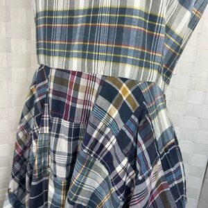 Blue, cream, yellow and maroon colors. Size 4. Measures approx. 17” across from armpit to armpit when laid flat and 14” across the waist (no stretch) 40” long from top of the shoulder to hem.