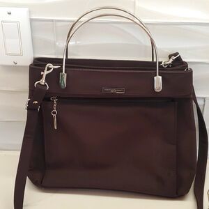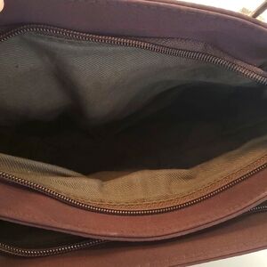 This purse is in good pre-owned condition. It has top handles that can be used to carry this purse as a handbag or it can be worn crossbody with a removable adjustable strap. It includes two zippered compartments, one with open storage, and one with a zippered pocket. The exterior includes a front zippered pocket as well. The exterior has some (hardly noticeable) areas of color darkening.