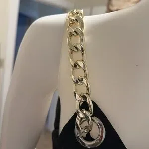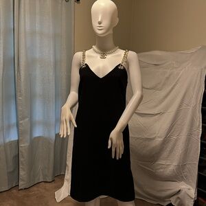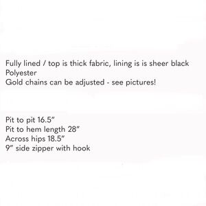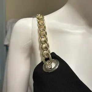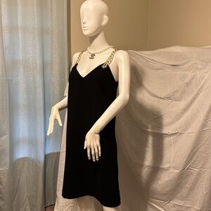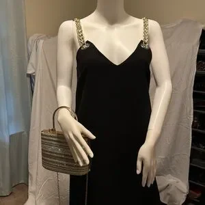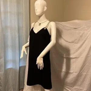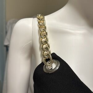 Gorgeous fully lined black mini dress with edgy gold chain straps. Worn one time to an event. Excellent pre-owned condition.