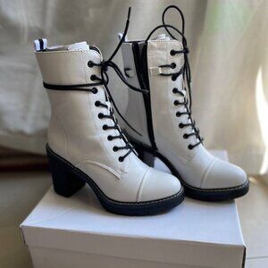 Up for sale are new with tags white lace-up heeled women boots by Catwalk (German brand "Deichmann", imported) in size 6. Have never been worn, come with tags and original box. High quality man-made materials (both inside and upper). Approximate measurements: 3.5" heel, total length from top to bottom is 9.5". True to size.