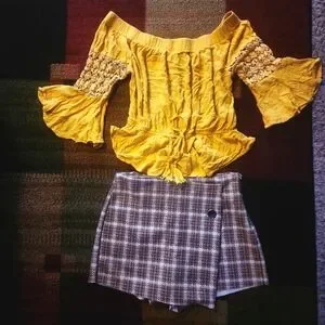 °Bottom: Tan/white/deep mustard colored skort, very soft and is size Large, fits comfortably a size 9-13 and is somewhat stretchy, zips on the side.