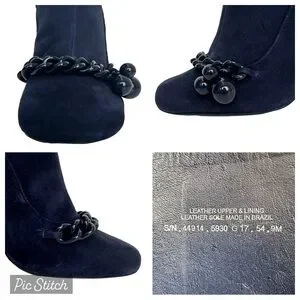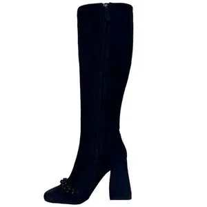 The Addison Boot is sculpted in plush suede, with a flattering arch enhanced by a sharply curved seam line and flared heel. A tonal curb chain and spherical bauble charms lend a playful finish.