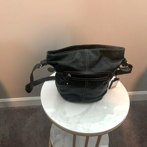 Black leather hobo style purse with double compartments. Both internal and external pockets. Barely used. Can be used as crossbody as well.