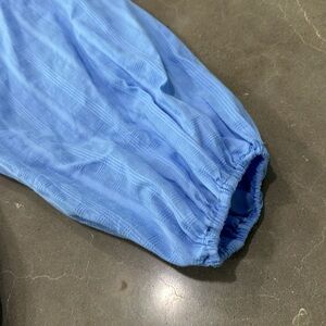 Plus size blouse. Pleated empire waist with strings that can be open or tied. Sleeves have elastic band. Ruffle collar. New.
