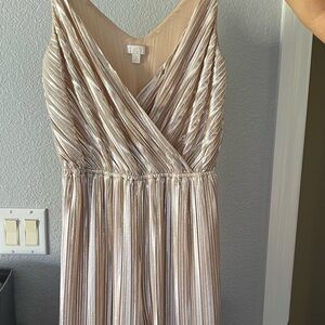 Gold pantsuit from Charming Charlie’s, size small. It has a boot cut leg and the material is very flowy and silky. Also has a lot of elastic so very stretchy.