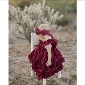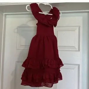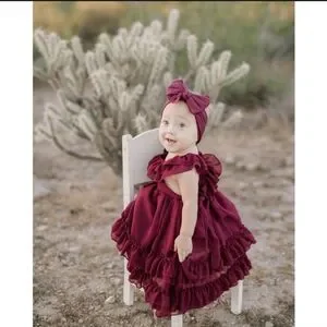 Beautiful burgundy ruffled dress in size 12 to 18 months toddler girl. Brand new with tags, I bought same dress in two different sizes for a family photo shoot and used the one that fit her best. So cute 🥰!!