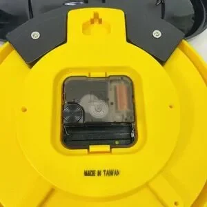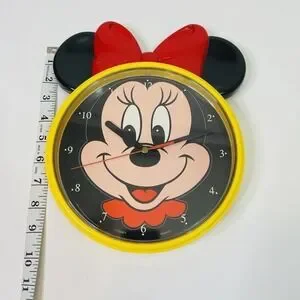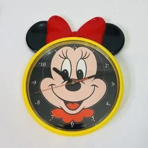 Minnie mouse shaped wall clock featuring yellow body, black ears, and red bow
