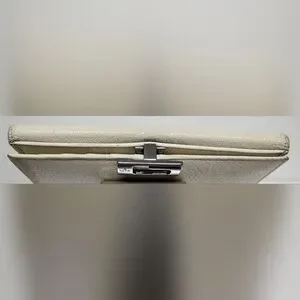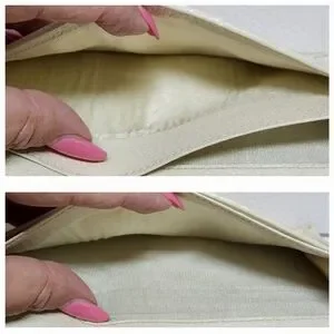 Body and trim in buttery soft pebble grain leather in a creamy ivory. There is slight discoloration, almost undiscernable. Corner rubbing with minor wear where the glazing has worn. But otherwise, the leather is soft and supple and in very good condition.