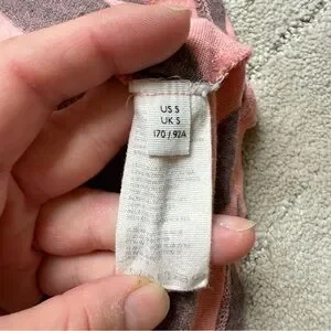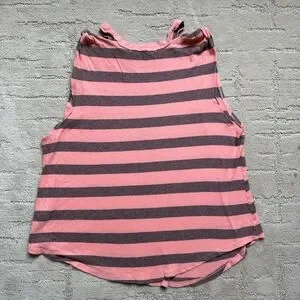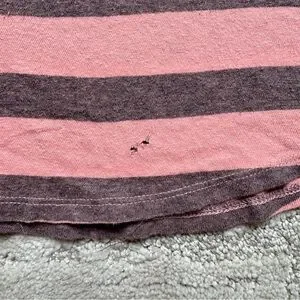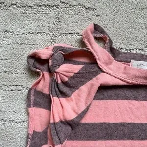 Light pink and gray striped. Twist tie straps. Distressing around neckline. Spring, summer, vacation, casual.