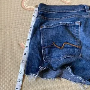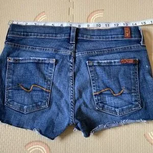 Medium wash size 28 waist cutoff boot cut style jean shorts from Seven for all Mankind. Low rise, 2 inch inseam.