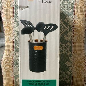 New in box, four piece kitchen utensil set. Solid spoon, slotted spoon, spatula, soup ladle with caddy