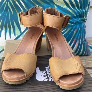 Gently worn SOREL Joanie wedge sandal. Size 6 US 23cm. No flaws! Original box. Color is Elk/Tan