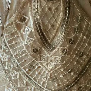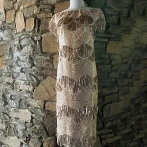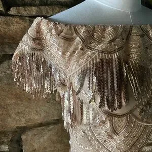Statement making Tadashi Shoji glittering sheath cocktail dress features sequined fringe that shimmers with every move! Art Deco inspired, this off-the-shoulder style has beautiful satin stitch embroidery, fringe-trimmed cap sleeves, and a curve-skimming fit. Lined, with hidden back zipper. New with tags.