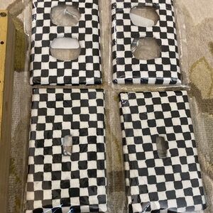 You get a 6 pc bundle of blk/white fabric checked switchplates/outlet covers, a hanging 🐷 “Let’s Eat” polka dot & checked sign & an ADORABLE 3 dimensional wooden HANDPAINTED blk/white check, avocado 🥑 green and polka dot pig 🐷 hanging decor. Kitchen art. Kitchen upgrade. (More outlet covers and switch plates also avail).