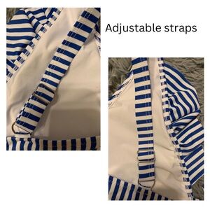 Lightly used Women’s Navy Blue & White Striped padded bikini top with ruffles and adjustable straps in size Large