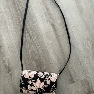 New without tags. Kate Spade Crossbody bag. Black with pale pink flowers. Adjustable black strap. Magnetic button closure with slots for credit cards and a zipper compartment