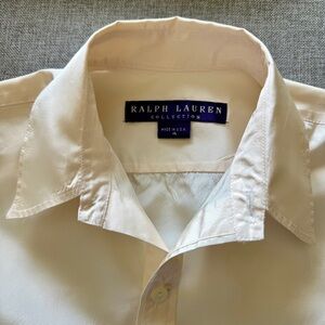 Simple yet sophisticated. This elegant button down shirt from Ralph Lauren is presented in crisp dupioni silk with mother of pearl buttons.