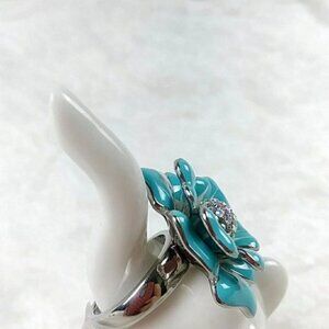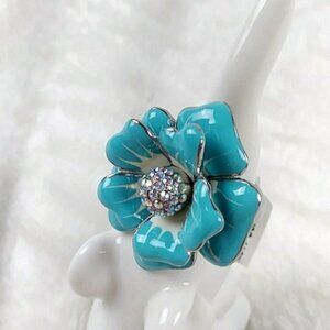 Stainless Steel Women's Flower Ring, Hypoallergenic Quality Stainless Steel, Big Bold Blue Blooming Flower with Crystal Rhinestones in Center. Stunning Statement Ring! Style Profile: Flower Ring, Spring, Summer, Floral, Chunky, Acrylic, Rhinestone, Bling, Boho, Indie, Feminine, Cocktail, Event, Gift, Special Occasion. Unique Jewelry. Brand New, Smoke Free Home, Fast Shipping!