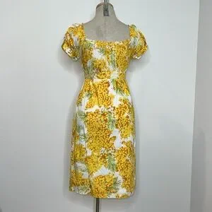 VGUC size 4. Color is gold, white, and green. Side hidden zipper closure, cap button sleeves, belt, front pouch pockets, front slip. Approximate measurements: armpit-18”, waist-13 3/4”, length-38”. J40-4096