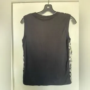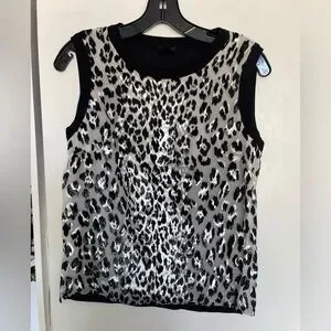 GIAMBATTISTA VALLI E MADE IN ITALY, ANIMAL PRINT TOP TANKS BLOUSE SIZE 42, WORN LIKE 2 TIMES, EXCELLENT CONDITIONS , beautiful piece with silk front , animal print little fuzzy like 3D with little sparks/ shiny , black trim around shoulders and neck , BACK plain black color mix fabric- viscose, polyester, silk, see pictures, pit to pit- 18 in, total long - 22 in, see pictures, FINAL SALE, NO RETURNS. CAME FROM SMOKE FREE, PET FREE HOME