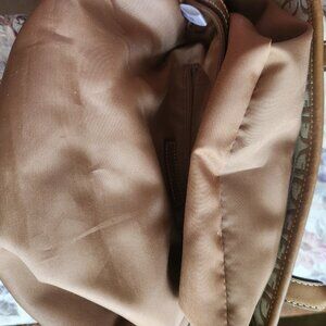 FOSSIL women's Hand/Satchel bag, Beige Canvas Signature Logo Print/ genuine leather trim and Handles, with Sign of this Brand-KEY. The bag is a Large, Measures-13"x9"x4.5", 2 handles, strap drop-10"+. Condition is a good with small sings of using-no visible damage Very nice item
