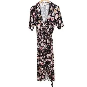 Black midi dress by Boden. Floral print. Wrap style - ties at the side. V-neckline. Stretch jersey knit. Size 14 LONG. Excellent condition!