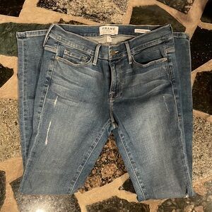 These stretch-denim skinny jeans are designed in an ankle-crop silhouette with subtle distressing at the knees for a worn-in look.