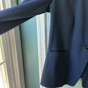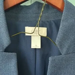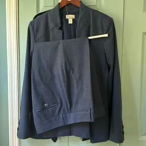 My favorite suit of all time that I have sadly shrunk out of being able to wear. Woven texture. Jacket is size 16. Pants are Julie (curvy) size 14. Straight leg. Always dry cleaned. My favorite top to wear with it is XL. Gauzy material in front tshirt material in back.