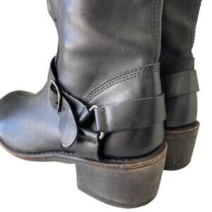 Description: Gee 'WaWa Biker boots with adjustable leather straps and harness detail. It has a low heel and long tongue, giving the shaft a more adjustable width if you want to tuck in pants. These are a rugged style what are built to last. This brand was sold at Anthropologie.