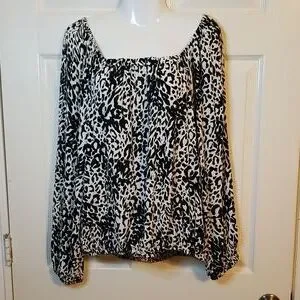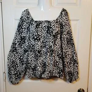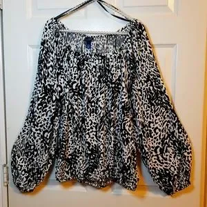 printed black, white, animal print, blouse, bell sleeve, square neck, lightweight top, flowy shirt, office wear, dressy, cute with Jean's, lightweight