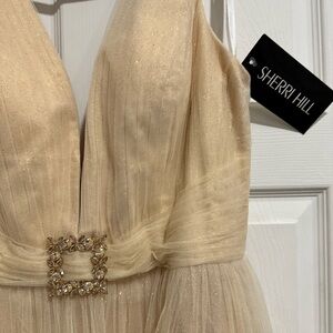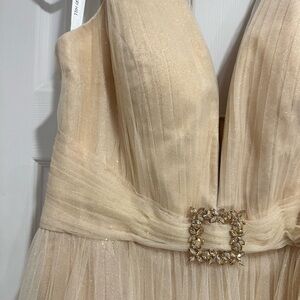 Tulle A-line with plunging deep V neckline, ruched bodice, and embellished belt buckle, four layered skirt. Color Champagne and gold