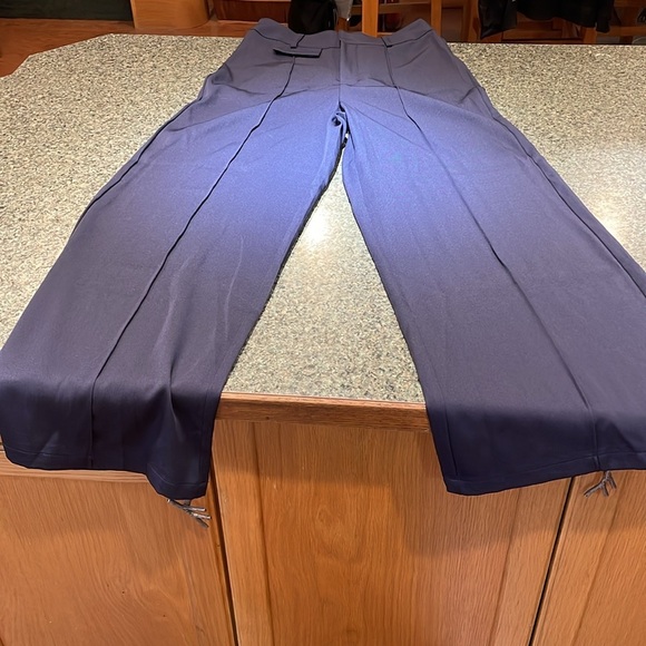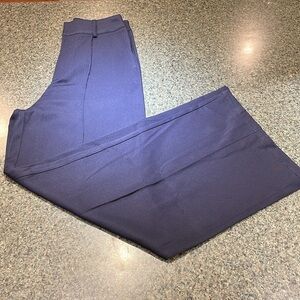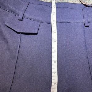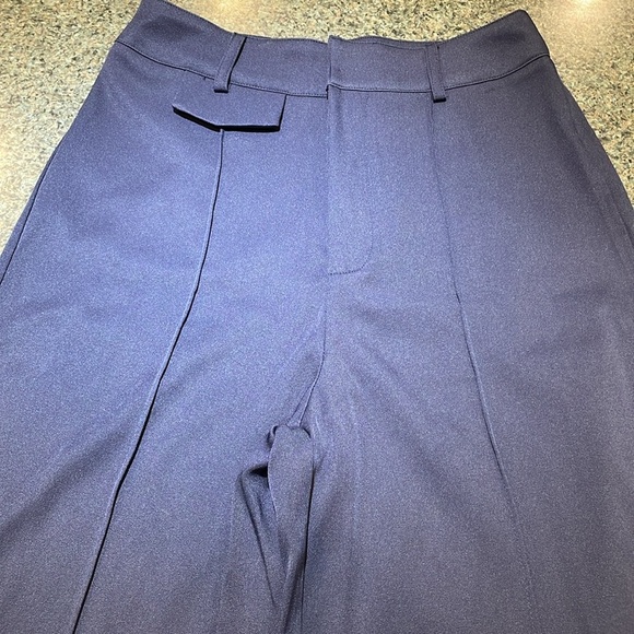 EUC excellent used condition. Medium Tall Navy slacks. Shein. No pockets. Faux pocket flap in front. Slider and zipper at waist. Wide belt loops. Flat back. Wide leg. Seam down center of front. High waist. 95% polyester 5% elastane.