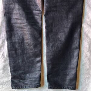 Zip fly with button closure. The pants have a shiny wet look to them catching the sun light beautifully. Tailored fit. Some minor fraying one inside seems, example shown in last photo. In excellent used condition.