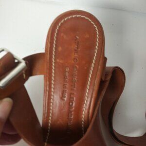 Attilio Giusti Leombruni shoes are made in Italy using the finest softest leather and they are hand stitched. This pair has a modified t-strap vamp of tobacco glove leather and copper patent with bold contrasting stitching. The Slingback adjustable strap and footbed liner are the same tobacco leather. Slightly padded footbed for comfort without detracting from the design and contrasting stitching holds footbed to the leather sole. The stacked heel is artfully slightly rounded to add to the gorgeous silhouette.