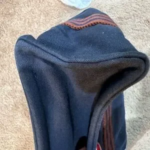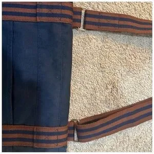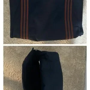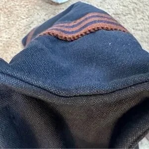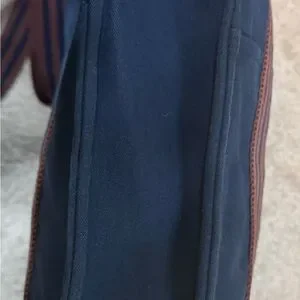 Very roomy canvas messenger bag. Navy blue and brown stripes. Unisex and clean inside out. No stains, tears or damage. The bag has 2 exterior large pockets (front and back) another large pocket when flap is open and one more zippered pocket inside.