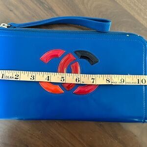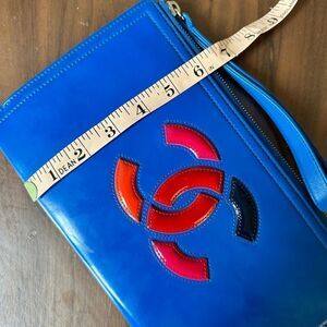 AUTHENTIC Chanel dark blue, lipstick, wristlet patent leather clutch with strap.