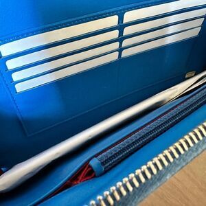 This clutch is stunning. The blue really pops! Clutch measures 6” x 11”. Strap is 7” long. Interior has slots for 8 credit cards and 3 pockets (1 zip).