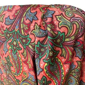 The Loft NWT Women's Medium Multicolor Patterned Long Sleeve Blouse is a vibrant and stylish addition to any wardrobe. This blouse features an intricate pattern in shades of green, blue, and red set against a stunning orange background, making it a standout piece. The fabric has a satiny and silky feel, offering a touch of luxury and ensuring all-day comfort.