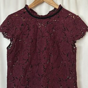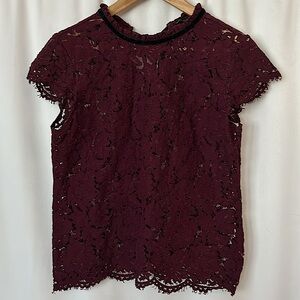 White House Black Market Wine Lace Velvet Short Sleeve Shirt Blouse Top **Sz S**
