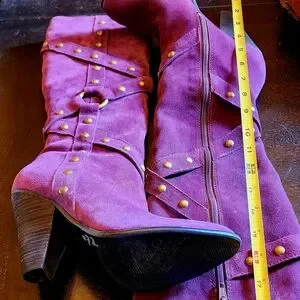 These boots are so cool. Great purple suede color, hard to find. Chris cross straps with studs. Color is closest to the first two pictures. Pair these with a cute dress of purple or other color to accent your outfit!!