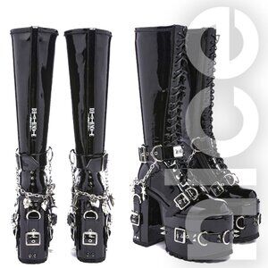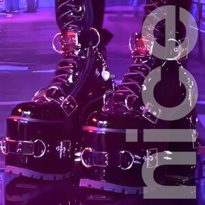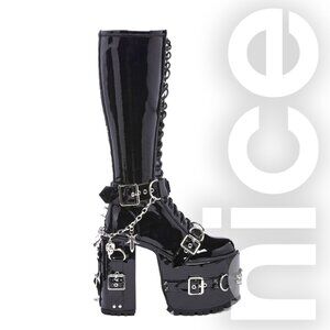These platform boots have a stretchy vinyl vegan leather construction, platform soles, block heels, buckle, spike, and D-ring detailing on the heels, Death Note brand logo printed on the back, a removable buckle with an antique nickel plate that has the name “Kira” inscribed, a removable charm bracelet with Death Note related charms, spikes on the back, front lace-ups, and side zipper closures. 6" Heel 4" Platform. Mint condition. Never worn.