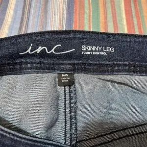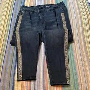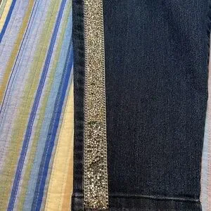 Dark walk jeans with rhinestone tuxedo stripe. Worn twice. Skinny fit, stretch denim.