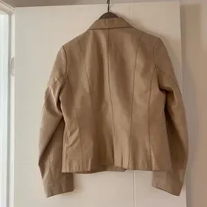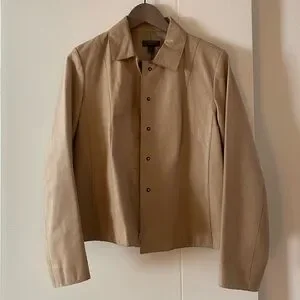 Vintage tan leather jacket from Classiques Entier. I love the snap buttons on this piece! Looks so modern. Size Medium but fits perfectly oversized on an XS or Small. Several small flaws/marks as shown throughout the jacket but does not affect the wearability imo.