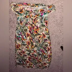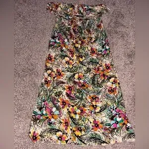 Worn. Size 2 floral maxi dress. Sleeveless with ruffle top detail and elastic waist. Colorful