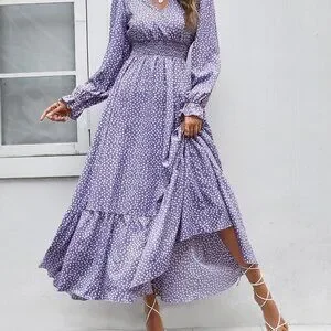 Purple Boho Womens Ditsy Floral Print Flounce Sleeve Shirred Dress