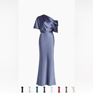 This one-shoulder gown is made from fluid satin with a draped bodice and column skirt.
