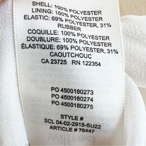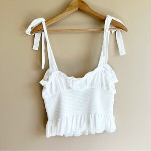This is a square-neck camisole with a smocked bodice, ruffled peplum trim and straps that tie at the shoulder. It’s made from lightweight, semi-sheer chiffon.