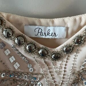 Champagne pink Parker mini dress with mixed media embellishments throughout, decollete neck, flounce hem and concealed zip closure at side. Includes additional embellishments. Beaded and sequined. Size small.