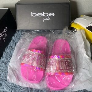 Bebe Girls’ Slip-On Slide Sandals with Rhinestone Logo Strap, Pink