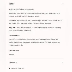 Features: Slip-on style, backless design, leather fabrication, thick toe strap, thin textured strap, flat sole, lined footbed